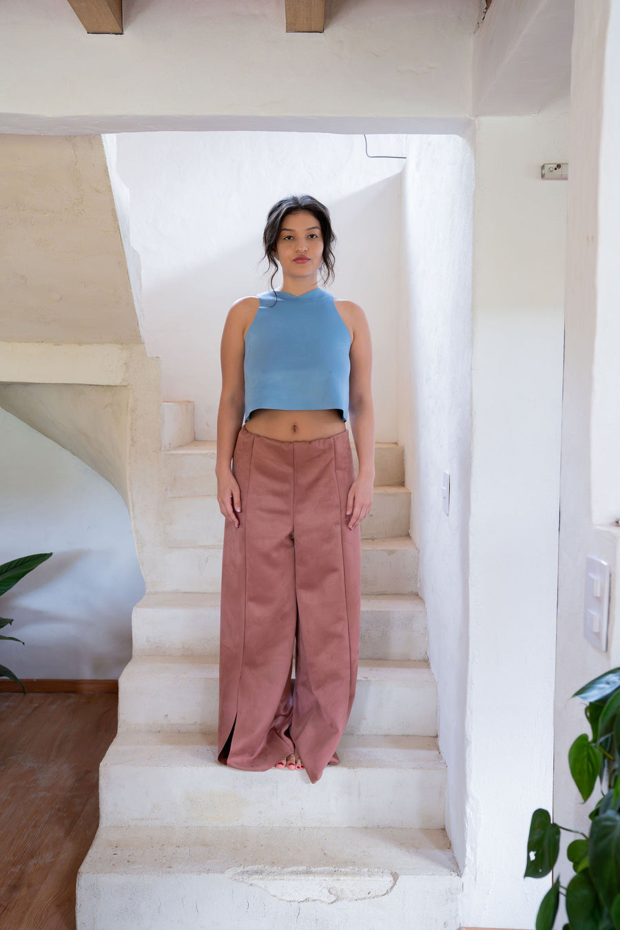 This piece is definitely a must-have in your closet; the Cleo Top is one of our iconic items. It has a cropped yet loose silhouette that fits perfectly on the shoulders and flatters your figure with its high neck. The fabric drapes beautifully, structured yet with flow and movement.